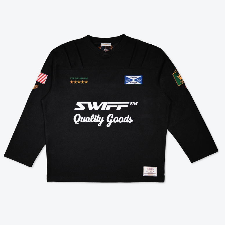 100% Polyester - Suede elbow patches - Ribbed crossover collar - Woven label -Appliquéd patches - Embroidered logos - Screen Printed logo