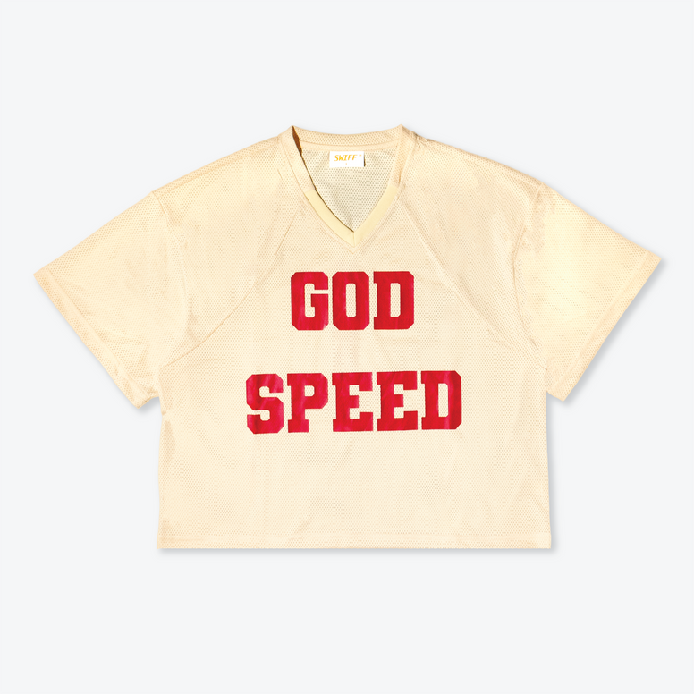 100% Polyester - Mesh/Ribbed trimmed v-neck - Waist length - Boxy fit - Printed logos - True to size